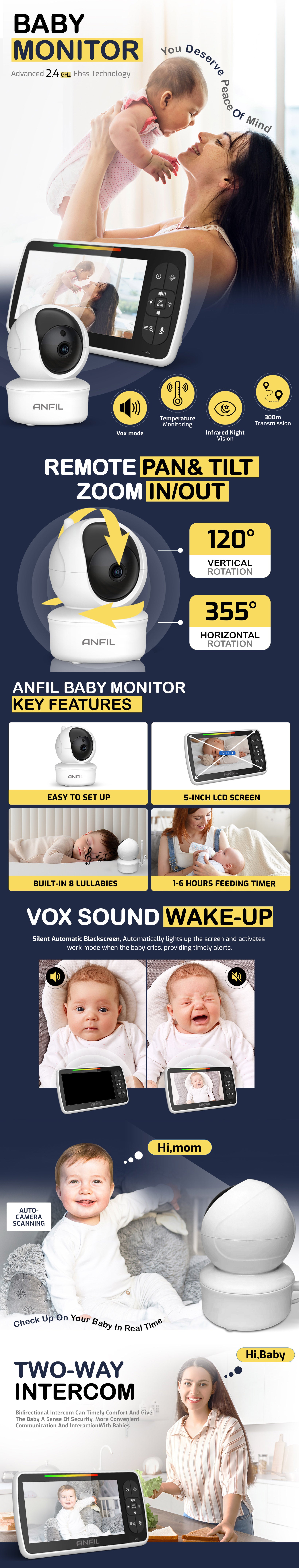 Der Anfil Baby Monitor ermöglicht eine einfache Raumüberwachung, indem Sie auf Ihr Baby zoomen und die Kamera für eine umfassende Abdeckung neigen können. Genießen Sie eine klare Sicht auf dem 5-Zoll-HD-Bildschirm für ein beruhigtes Gefühl.